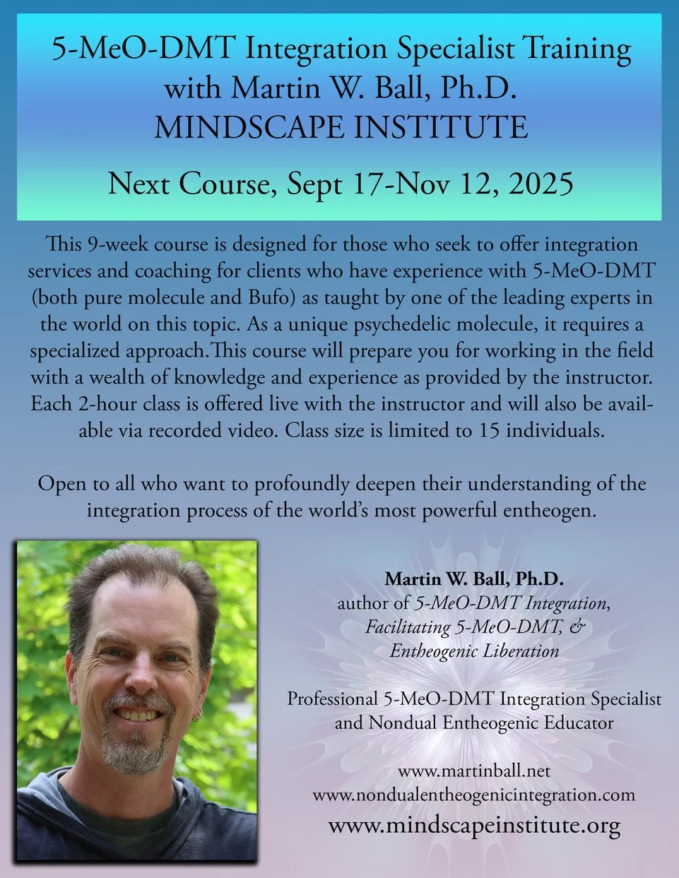 As an instructor at Mindscape Institute, I teach in the 5-MeO-DMT Facilitator Training course, and also teach my own course, 5-MeO-DMT Integration Specialist Training. Because 5-MeO-DMT is such a powerfully unique psychedelic, it requires specialized training in order to adequately assist individuals with integration. As a leading expert in the field, I enjoy sharing my extensive experience with students. Classes are limited to 15 individuals. The next offering of the Integration Training course will start on Sept 17, 2025. You can contact me directly about joining the course, or visit Mindscape and enter your info via the “opt-in” page and receive more info.